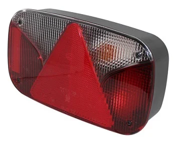 Vanlig på större Henra flaksläp. 4-funktionslykta Bak-,broms-,blink-,skyltlykta med 5-pol. bajonettkontakt inkl. glödlampor (413, 418, 419) 244x138x60 mm E9 5447