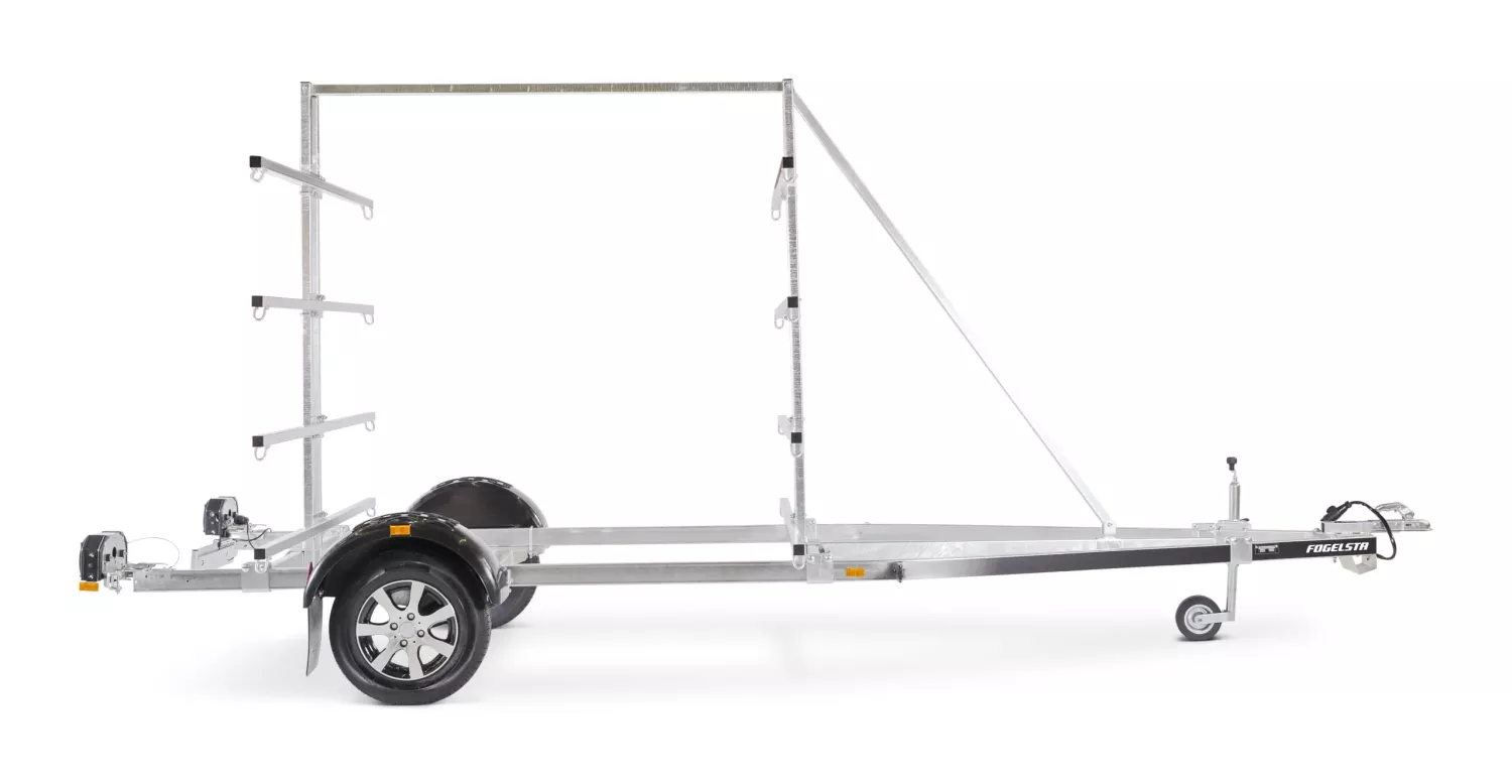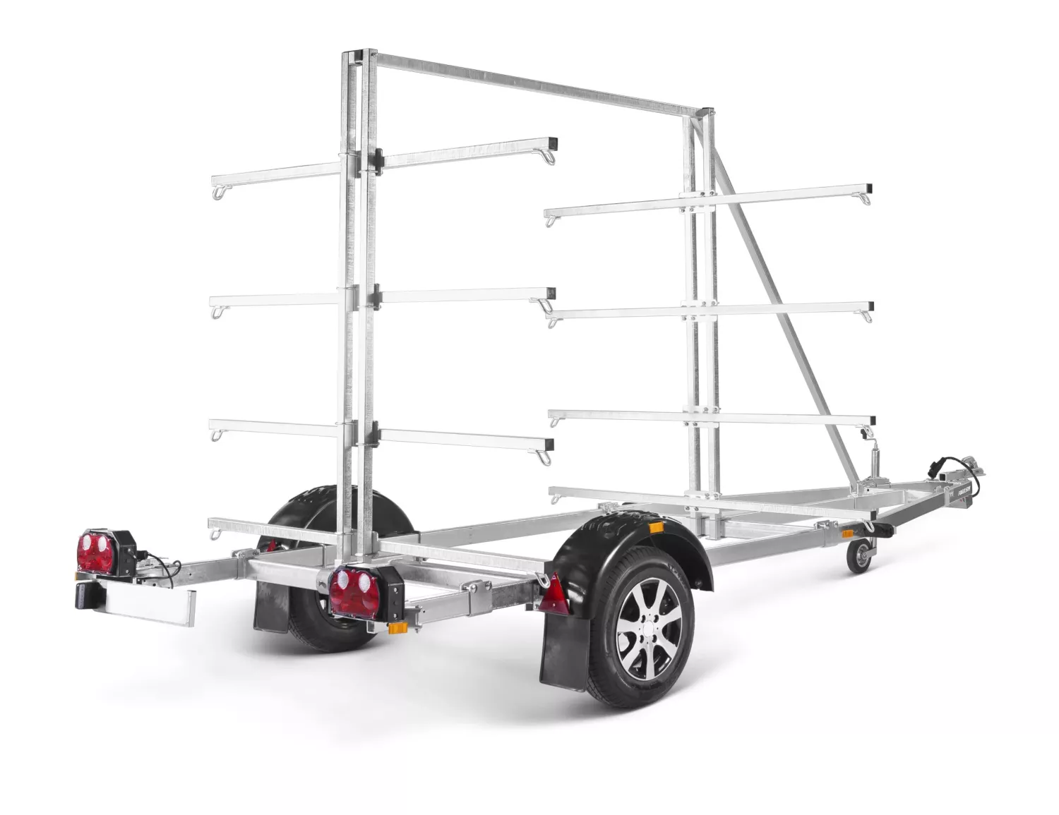 Med våra kanottrailers har du möjlighet att transportera upp till 16 kajaker eller 8 kanoter. Ställningen går lätt att justera efter kanoternas storlek. När kanotstället är monterat har trailern en totalhöjd på cirka 240 cm. V-drag och justerbar hjulaxel hjälper till att göra ekipaget stabilare och säkrare. Själva stativet har följande mått, höjd 200 cm, längd 199 cm, bredd 191 cm, lastlängd 344 cm och lastbredd per sida 85 cm. Båttrailern på bilden kan vara extrautrustad.