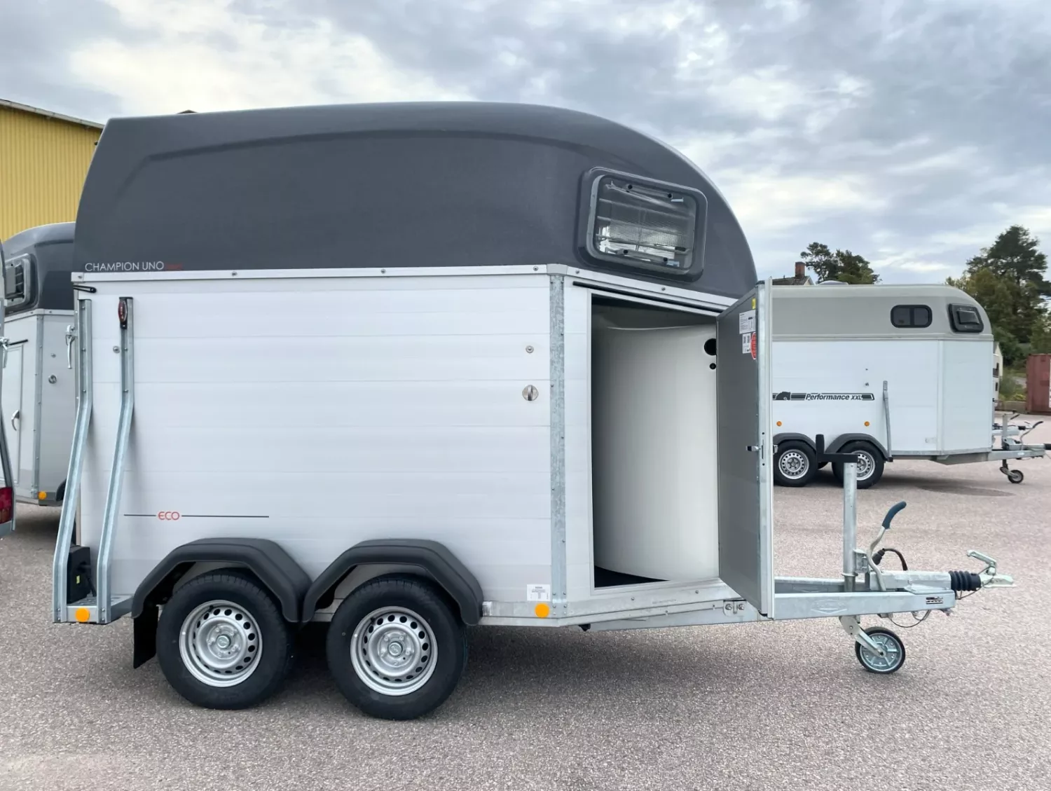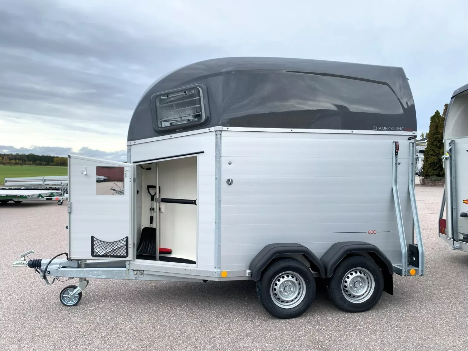 1,5-hästarstransport från välkända Böckmann byggd i aluminium och stål med sadelkammare (utdragbara sadelhängare, krokar, spegel, nät, sopkvast och skyffel mm), krubba, sparkskydd, öppningsbara fönster, innerbelysningar, säkerhetsbom mm. Välj totalvikt för att passa din bil och körkort, 1100-1600kg, egenvikt 760kg. Mycket bra hästsläp för pengarna!