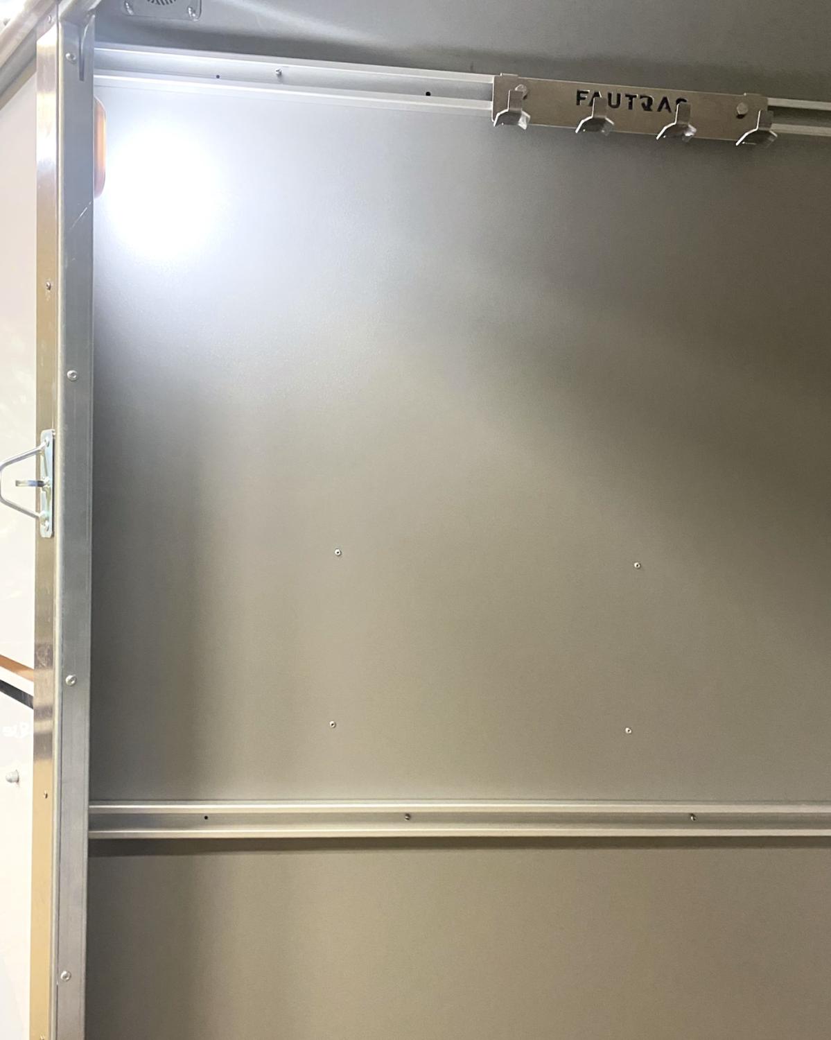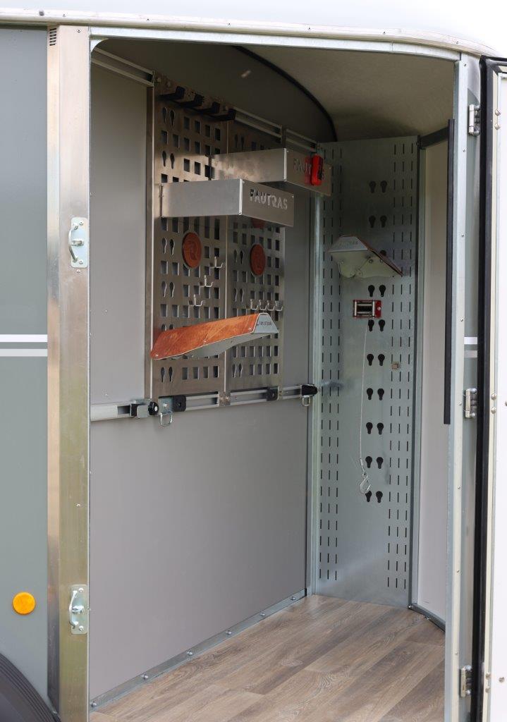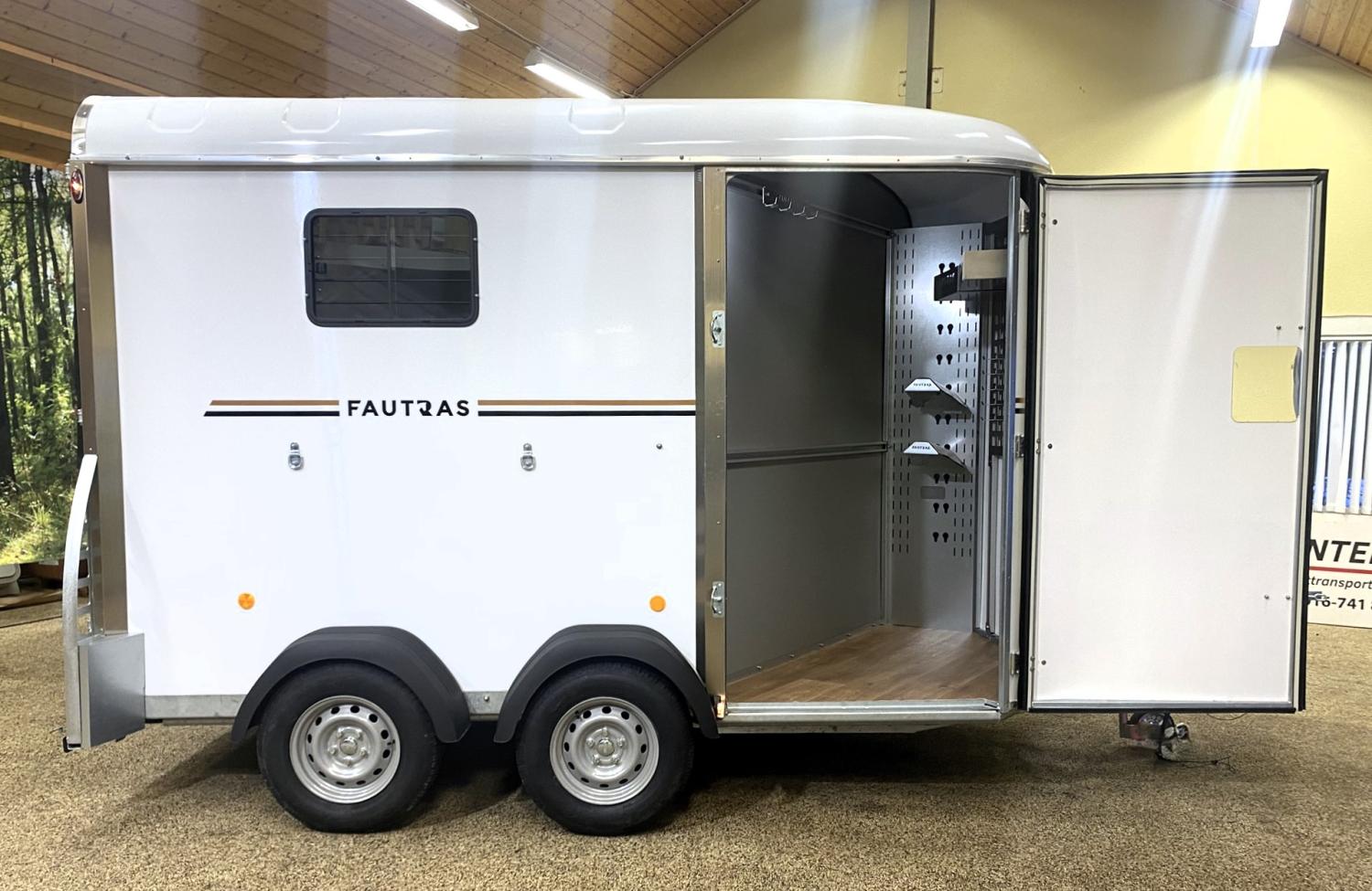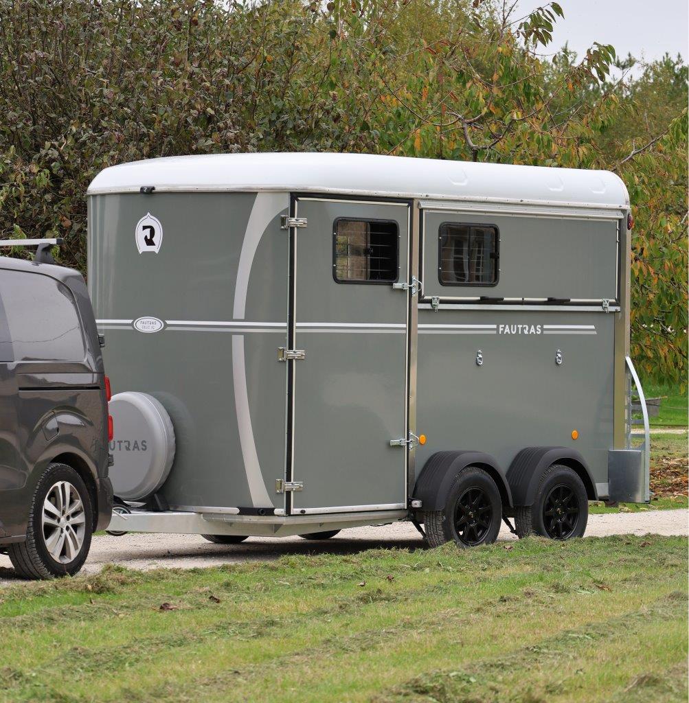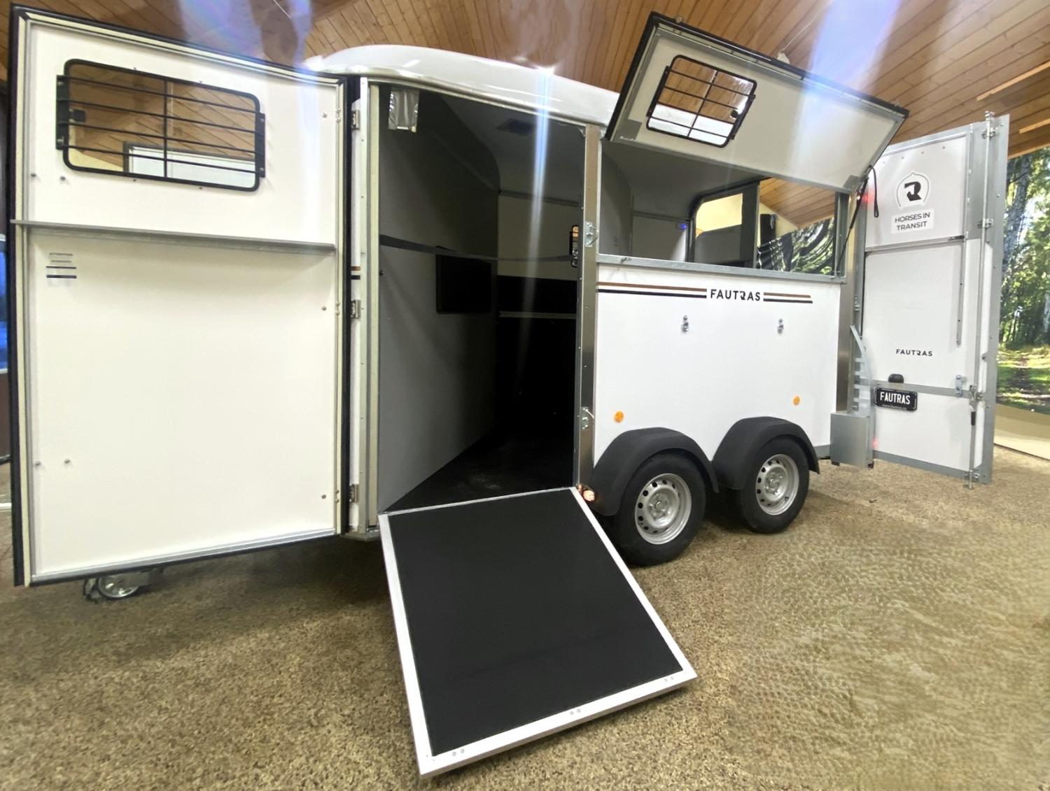 Frambomsfri hästtransport där du kan ändra så den blir stuterimodell. Ett mycket konkurrenskraftigt alternativ till B-kortlastbil både gällande säkerhet och ekonomi. Byggd i genomgjutet glasfiber, kvalitativt stål och med isolerat vitt tak. Hästsläpets golvskiva är i polyethylen med livstids garanti mot röta. Alla Fautras hästtransporter har halkfri gummimatta och två dörrar bak med step up för enklare lastning. Överluckor på bakdörrarna ställbara i olika lägen för bästa möjliga ventilation. Individuell underhållsfri fjädring. Välj mellan 3 färger och stripes i valfri färg ur Fautras hästtransporters sortiment. Mellanvägg Fautras TECH är ställbar, flexibel och mycket tålig. Har även har kraftiga sparkskydd, uppbindningsöglor invändigt och utvändigt, reservhjul, kraftigt stödhjul och låsbar kulhandske som standard.
