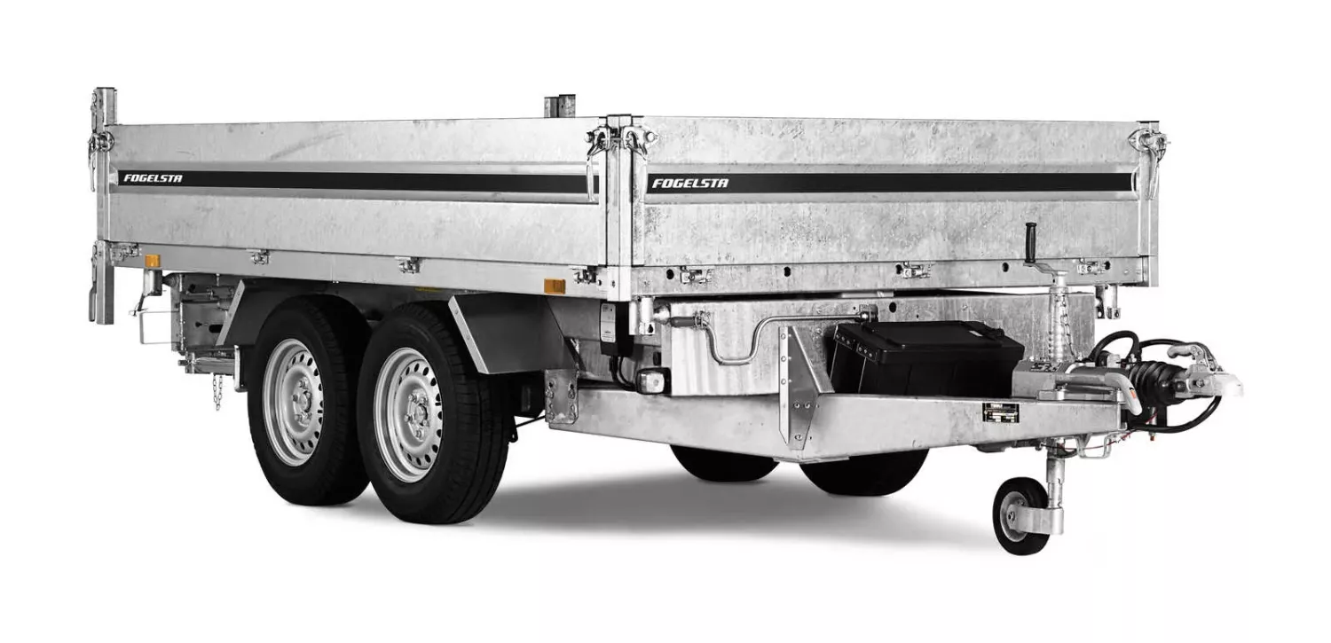 Varmgalvaniserat, helsvetsat chassi och stålflak gör trevägstippern till en slittålig lösning för såväl minigrävare och kompakttraktorer som ved och grus. Elektrisk tipp åt tre håll, manuell nödtipp, spridarläm bak och infällda bindöglor. Vagnen på bilden kan vara extrautrustad.