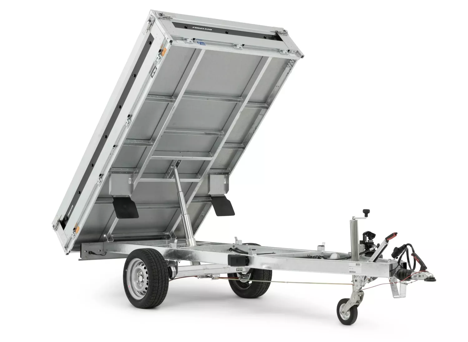 En perfekt arbetskamrat för entreprenören och för transport och lastning av sand, ved eller grus. En robust och enkelaxlad envägstipp. Förstärkt flakskiva i stål med manuell hydraulisk tipp för enkel användning. Hög tippvinkel gör släpvagnen smidig för lastning samt transport av grus, trä eller byggmaterial. Fällbara och avtagbara lämsidor, avtagbara hörnstolpar och presenningsknappar som standard. Sex kraftiga invändiga bindöglor integrerade i flakskivan. Utrusta släpvagnen med nätgrind, förhöjningslämmar, kapell eller något annat tillbehör ur det breda sortimentet som är gemensamt med Serie 4000. Vagnen på bilden kan vara extrautrustad.