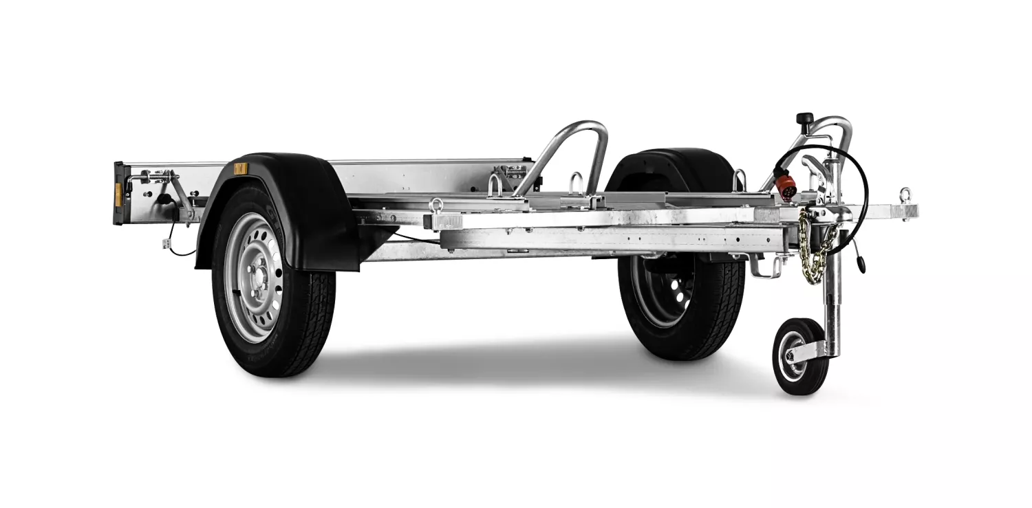 Flyttbar uppkörningsramp Flexibla surrningslösningar Plats för två MC With this trailer it is easy and convenient to transport all kinds of motorcycles and mopeds. The trolleys have high security with smart lashing. Low drive-up angle, excellent driving characteristics and movable drive-up ramp. The cart in the picture may be extra equipped.