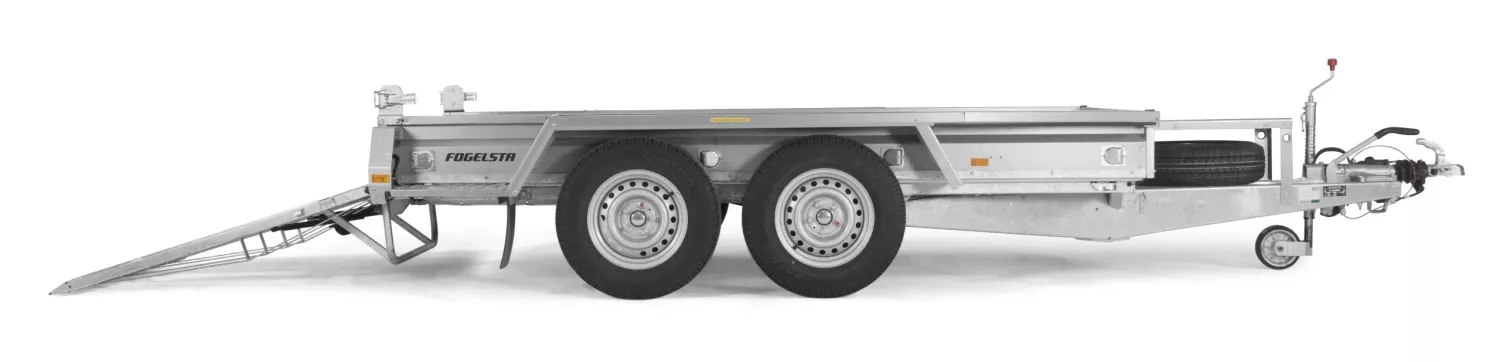 För entreprenörer och maskinuthyrare som fraktar små, tunga maskiner, t.ex. minigrävare och grävare. Utmärkt uppkörningsvinkel tack vare den långa rampen. Gångborden på sidorna gör det lätt att stiga in och ut ur lastade maskiner. Integrerade stödben förenklar lastning. Vagnen på bilden kan vara extrautrustad.
