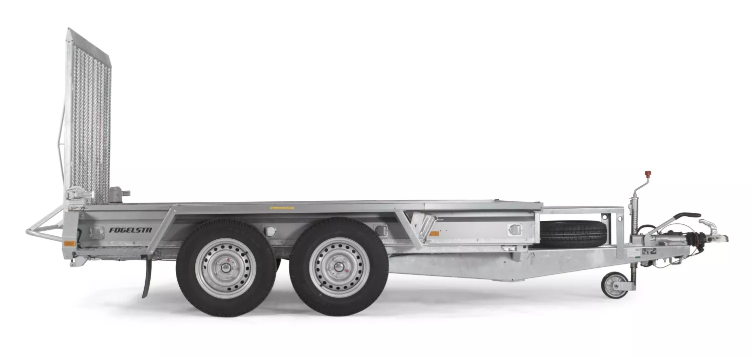 För entreprenörer och maskinuthyrare som fraktar små, tunga maskiner, t.ex. minigrävare och grävare. Utmärkt uppkörningsvinkel tack vare den långa rampen. Gångborden på sidorna gör det lätt att stiga in och ut ur lastade maskiner. Integrerade stödben förenklar lastning. Vagnen på bilden kan vara extrautrustad.