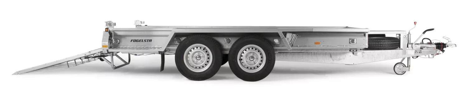 För entreprenörer och maskinuthyrare som fraktar små, tunga maskiner, t.ex. minigrävare och grävare. Utmärkt uppkörningsvinkel tack vare den långa rampen. Gångborden på sidorna gör det lätt att stiga in och ut ur lastade maskiner. Integrerade stödben förenklar lastning. Vagnen på bilden kan vara extrautrustad.