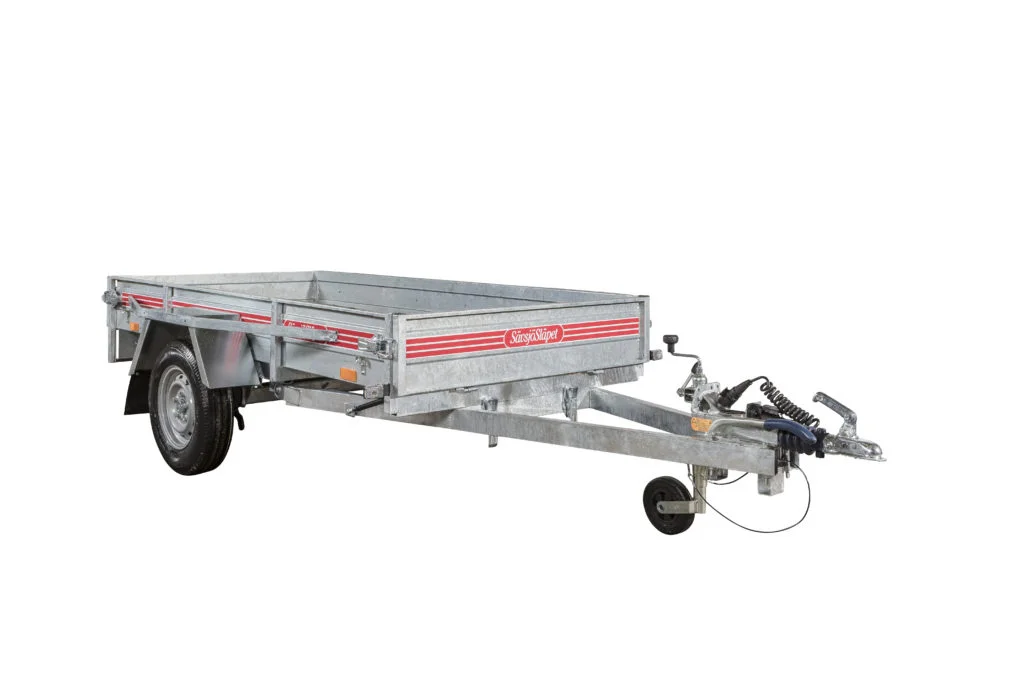 Totalvikter: 850, 900, 1000, 1100, 1250, 1300, 1400, 1500 kg. Lastförmåga: 525, 575, 675, 775925, 975, 1075, 1175 kg. Levereras med odämpad tipp, spiralkabel, stödhjul, invändiga surrningsöglor CE-märkta, utvändiga bindkrokar, 5-bultsfälgar samt plåtskärmar med avbärare