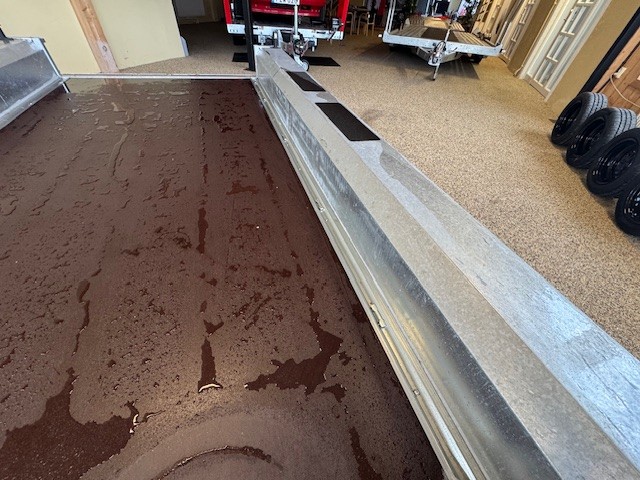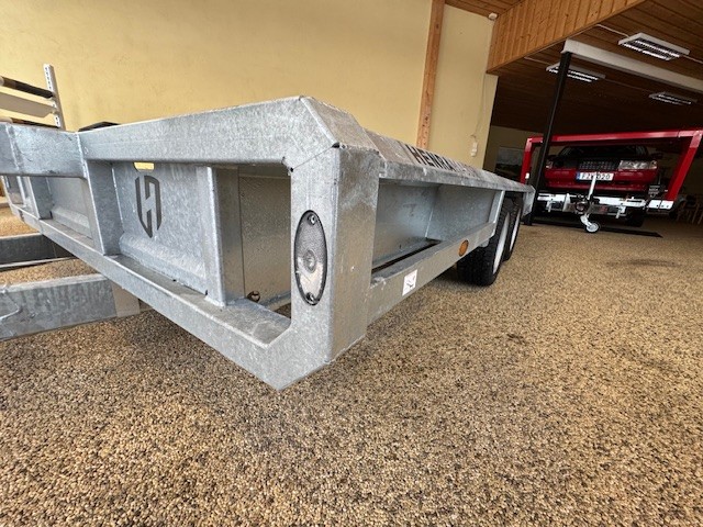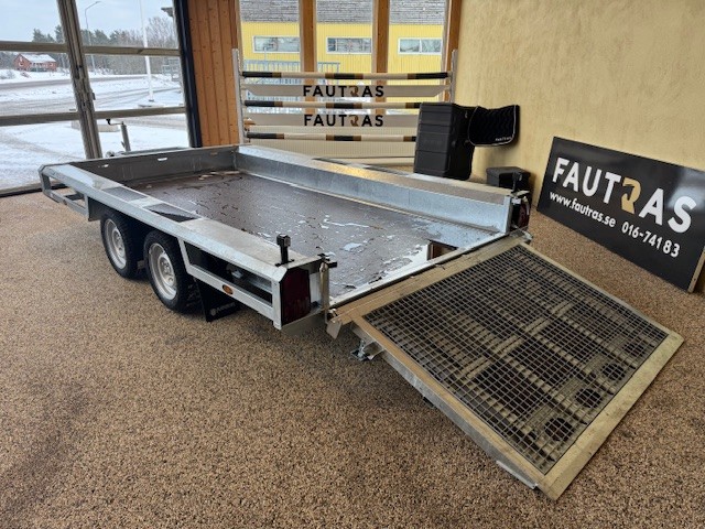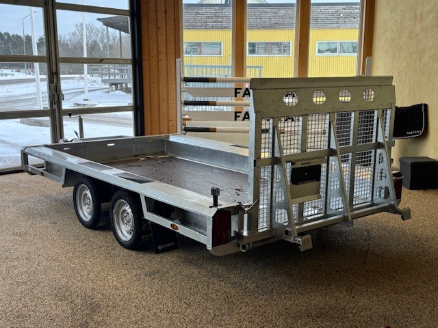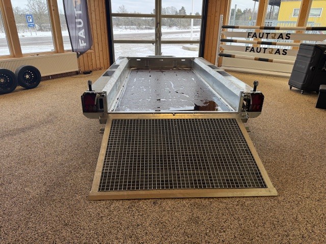 Extremt lättlastad och tillräckligt låg för saxliftar Bultade dragstänger med möjlighet att justera dragets höjd Försänkta surrningsöglor i flaket Väldigt låg lasthöjd för lätt på och avlastning 115cm lång ramp med integrerat stöd och mekanisk hjälpfjäder Speciellt utformad stängning så inte rampen skramlar Kraftigt skopstöd med plats för reservhjul under Infälld Led-belysning i kantbalk och fram Kraftig 18mm marinplywood i en solid bit Däck 185/60R12 5/112 bultmönster