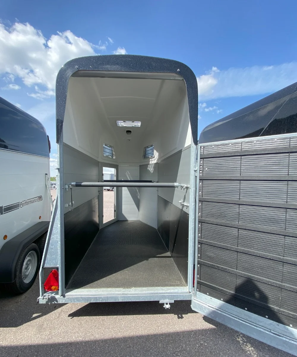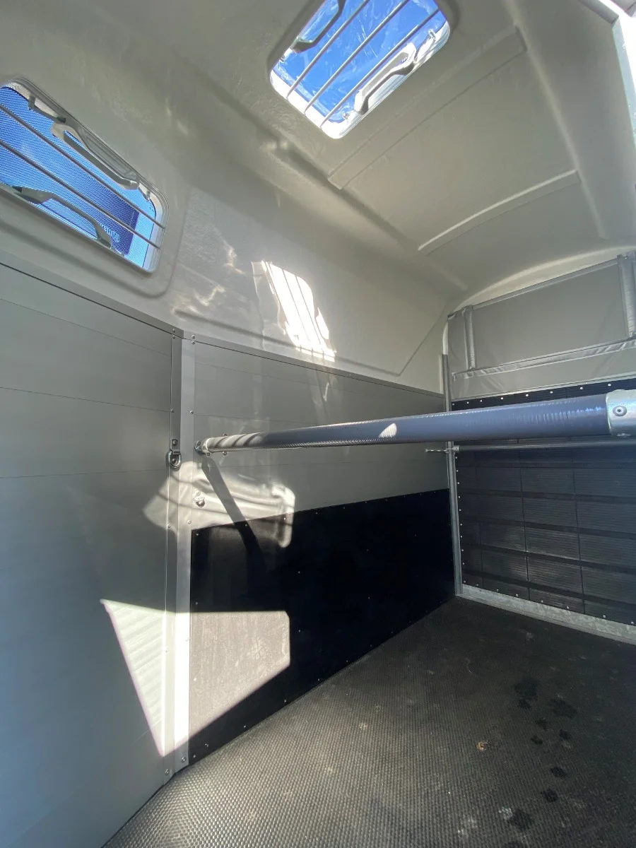 130cm bred hästtransport för en häst. Rymlig och stabil. Öppningsbara fönster, kombiramp, sparkskydd, taklucka mm. Hård överlucka kan eftermonteras, gardin idag. Totalvikt upp till 1300kg=lastvikt 640kg. Välj för att anpassa till din bil och körkort.