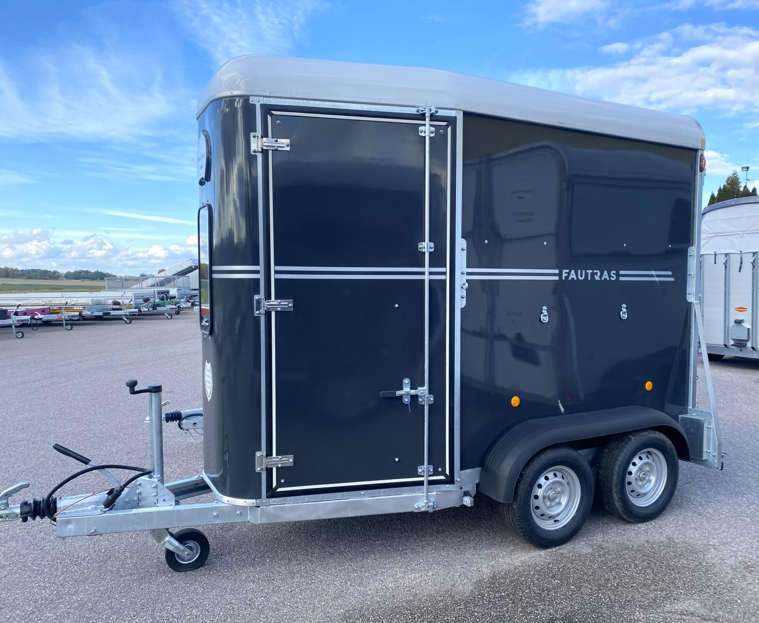 Med unika vägegenskaper är den fantastiskt stadig bakom din bil. Transporten har stor framdörr som kan användas som fronturlastning Hästtransporten är helt i genomgjuten glasfiber. Golvskiva i polyetylen med livstids garanti mot röta. Framfönster. Individuell underhållsfri fjädring. Mellanvägg i flexibel och hållbar Fautras TECH. Fällbara frambommar med säkerhetsutlösning. Dörrar bak med överluckor ställbara i olika lägen. Sänkt golv bak för lågt insteg. Hingstvägg. Invändiga uppbindningsöglor. Utvändiga uppbindningsöglor. Innerbelysning. Högeffektiv ventilation. Vadderade väggar. Höga sparkskydd. Automatiskt stödhjul. Reservhjul. Halkfri gummimatta. Låsbar kulhandske.