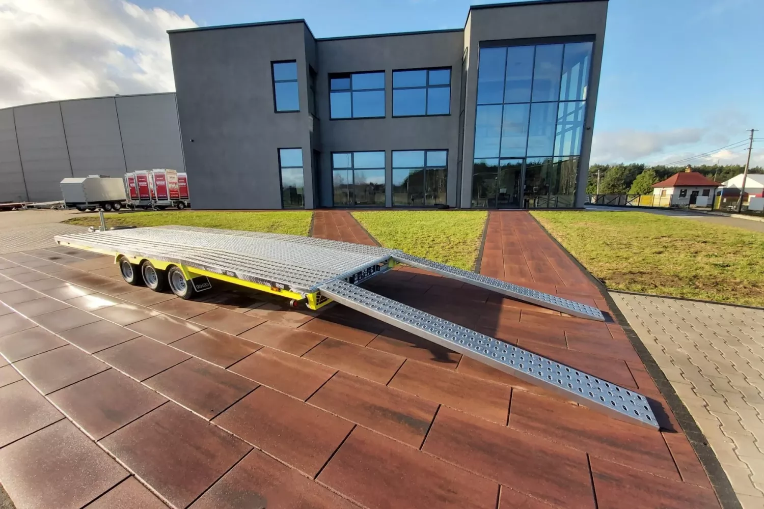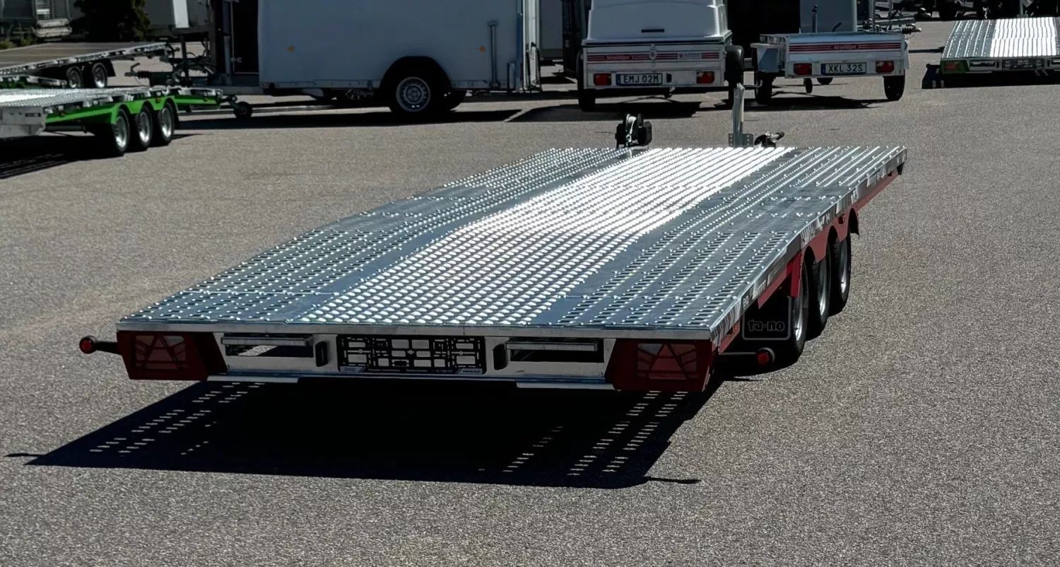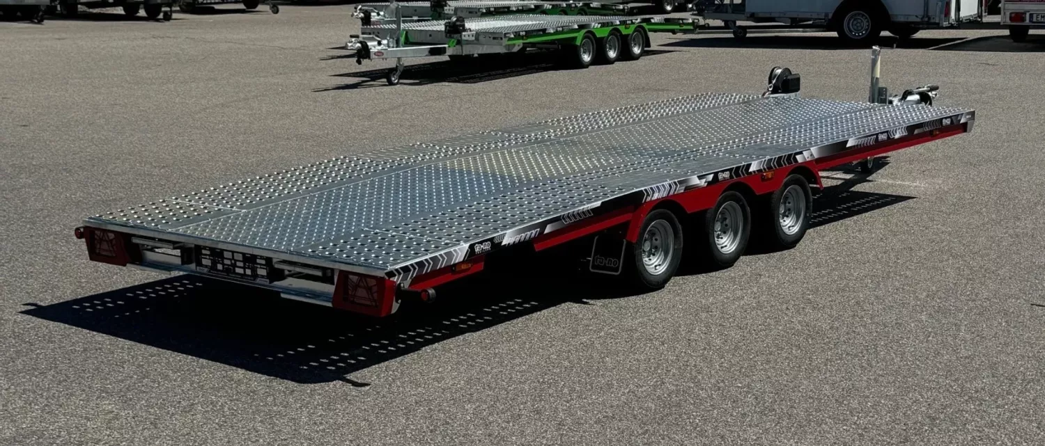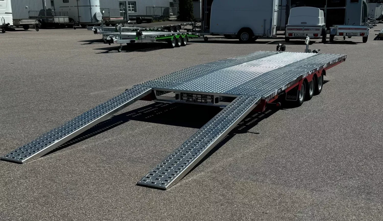 standard är: led belysning, smart låsning för ramper. Ett handgrepp frigör man båda ramperna och får dessutom helt skrammelfritt vid färd. Ramperna är 2 meter långa i stål. Kraftigt automatiskt stödhjul, skydd över bakljus mm.