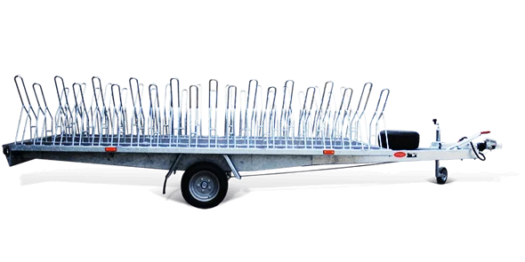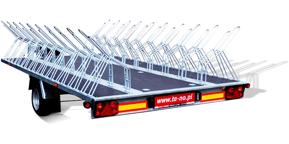 Specialiserad lastvagn som används för cykeltransport. Denna modell är avsedd för 20 cyklar med 26", 28" och 29" hjul.En axelkonstruktion med bromssystem och transportstationer, tillverkad av ökat motståndsstål. Möjlighet att anpassa en anpassad konfiguration av transportstationer.