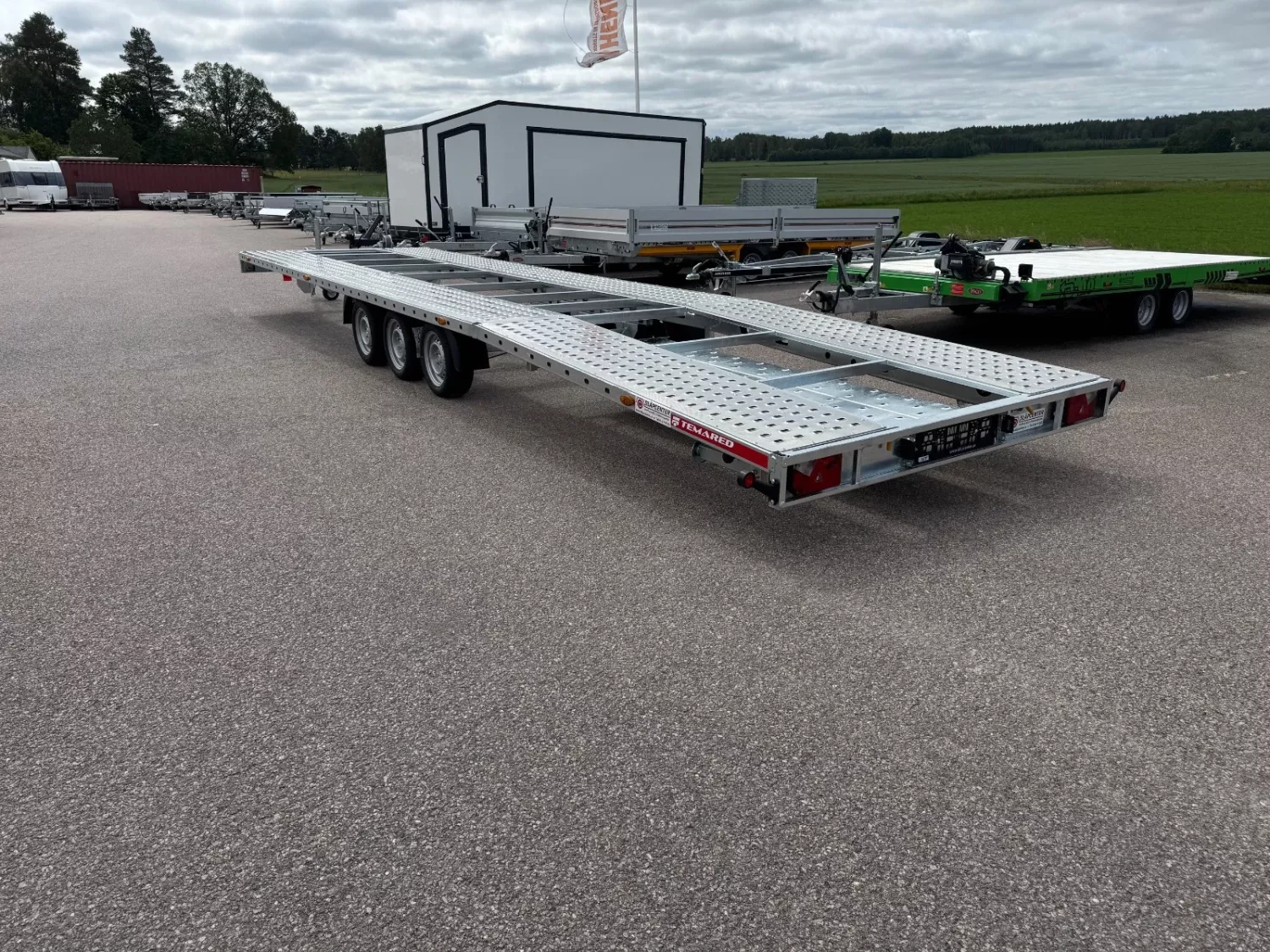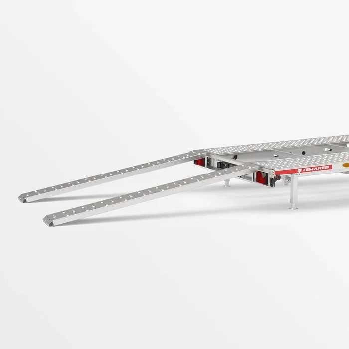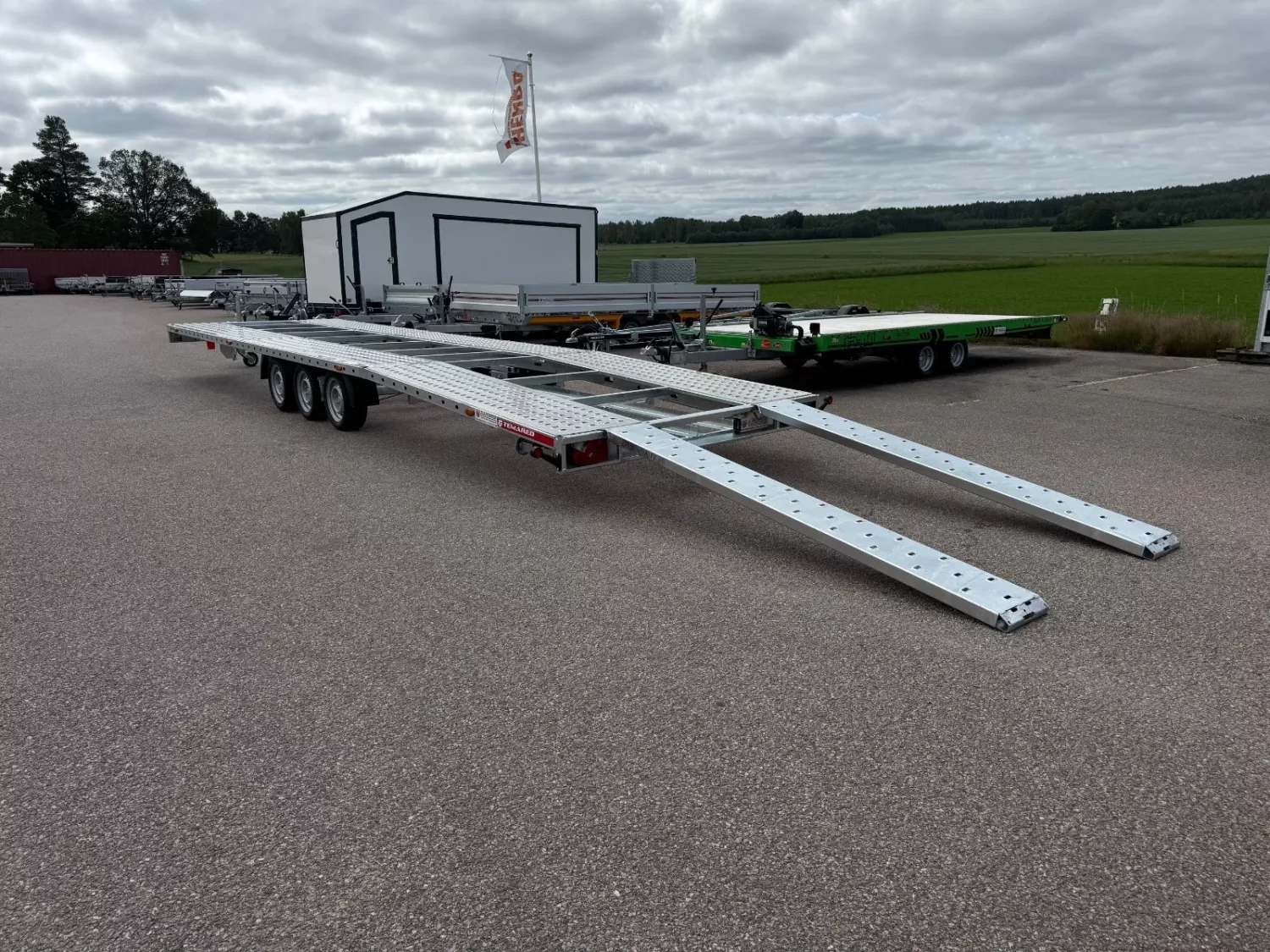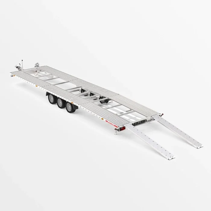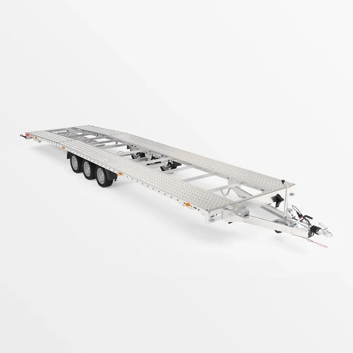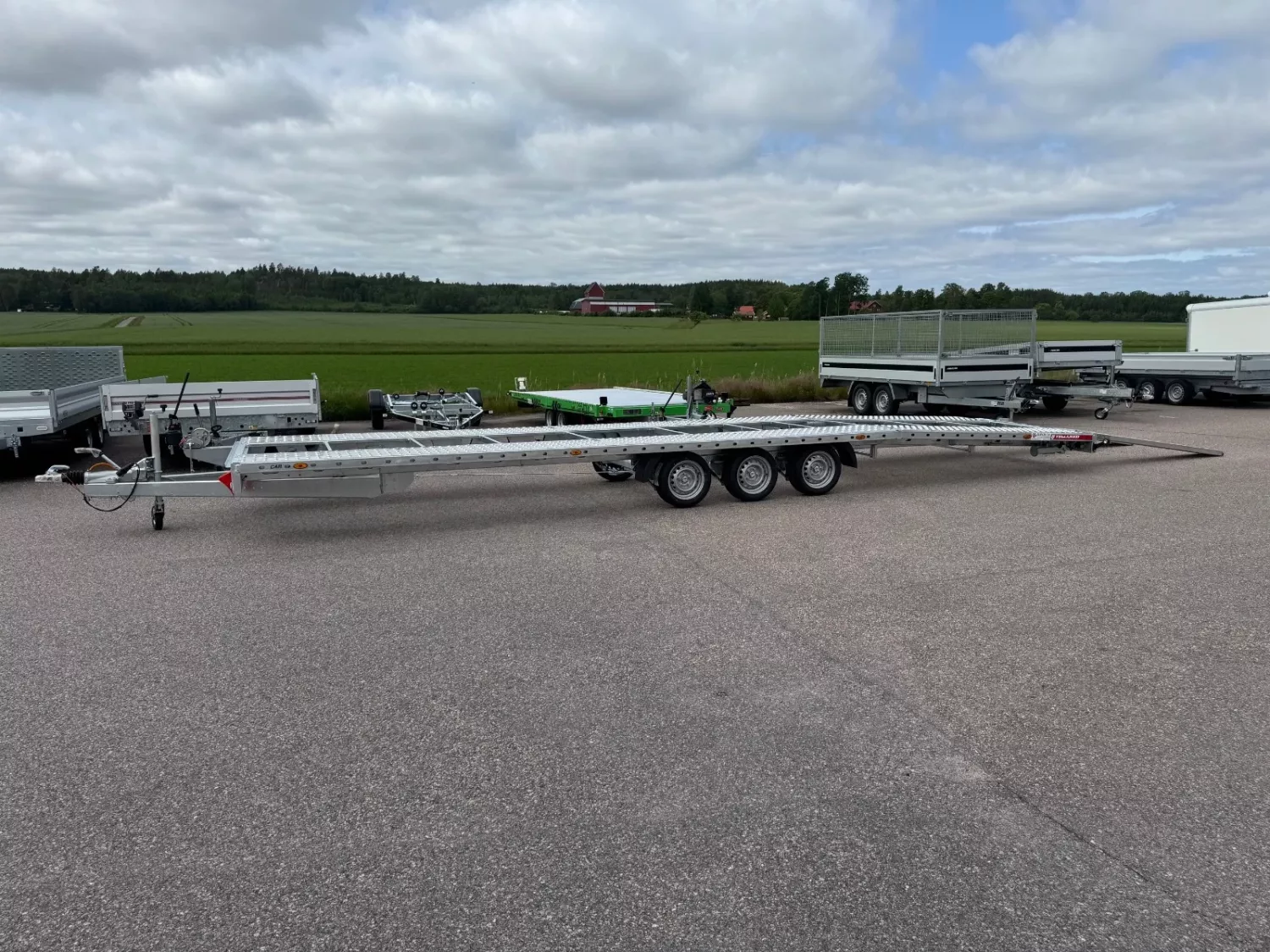 Biltransportsläp med bruten (vinklad) flakyta för förbättrad lastvinkel.